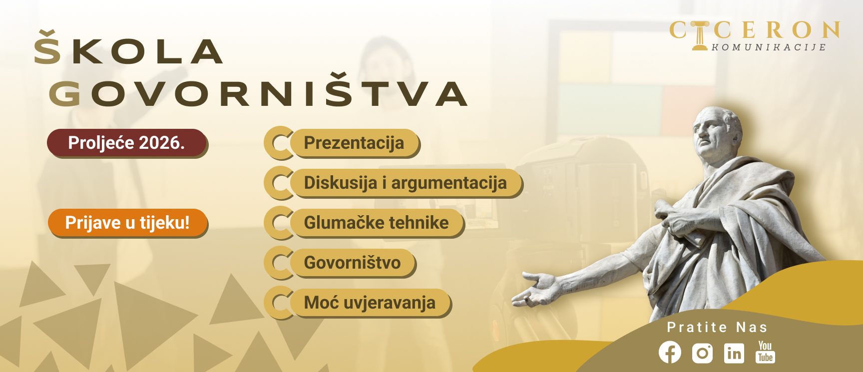 Pridružite nam se u šestomjesečnom programu Škole govorništva Ciceron, razvijajte s nama svoje vještine javnog i medijskog nastupa i naučite kako svoje ideje, organizaciju, proizvode ili usluge uspješnije, efektnije i uvjerljivije prezentirati. Osnažite svoje kompetencije za uspješne poslovne prezentacije i prodajne razgovore, te sudjelovanje na konferencijama i panelima u poslovnom okruženju!